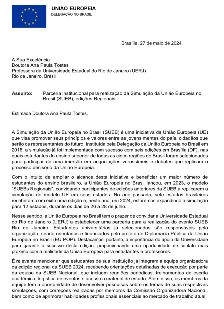 A Cátedra Jean Monnet na Universidade do Estado do Rio de Janeiro tem o prazer de apoiar a realização da Simulação da União Europeia no Brasil no Rio de Janeiro. A SUEB é um evento promovido pela Delegação da União Europeia no Brasil que busca fortalecer os laços entre a comunidade europeia e estudantes brasileiros e brasileiras de ensino superior. Sendo realizada desde 2018 em Brasília e expandindo-se para outros estados em 2022, a SUEB propõe debates de alto nível, instigando o conhecimento dos(as) participantes e fornecendo experiências acadêmicas e interpessoais únicas. As SUEBs Regionais são edições locais da SUEB, sem taxa de inscrição, com inscrições abertas ao amplo público do ensino superior brasileiro. No Rio de Janeiro, a SUEB-RJ chega a sua segunda edição e terá como tema "Combate à desinformação em defesa às instituições democráticas".